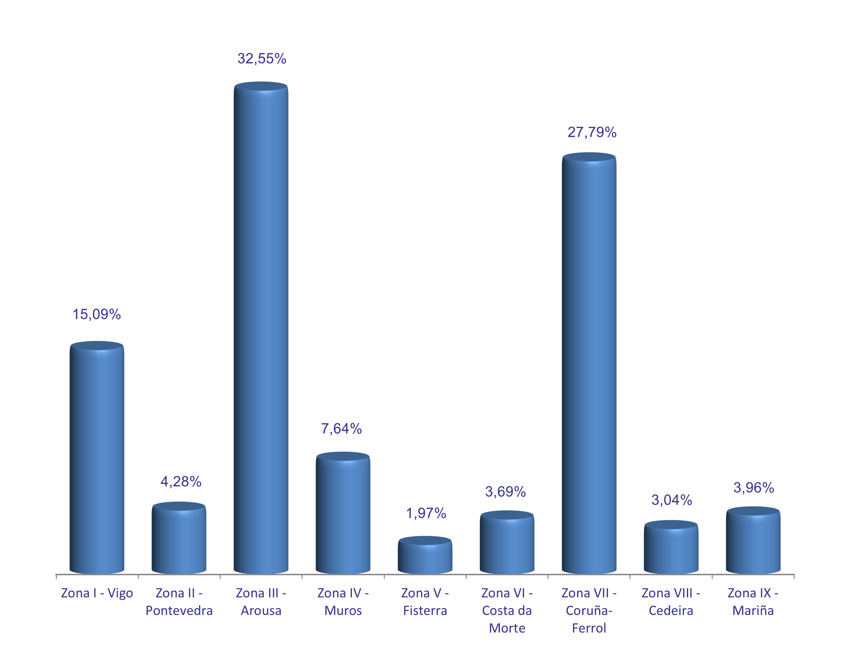 | Zona VIII - Cedeira | 128 | 14.764 | 3,04% | 176.655 | 2,93% | 11,97 |