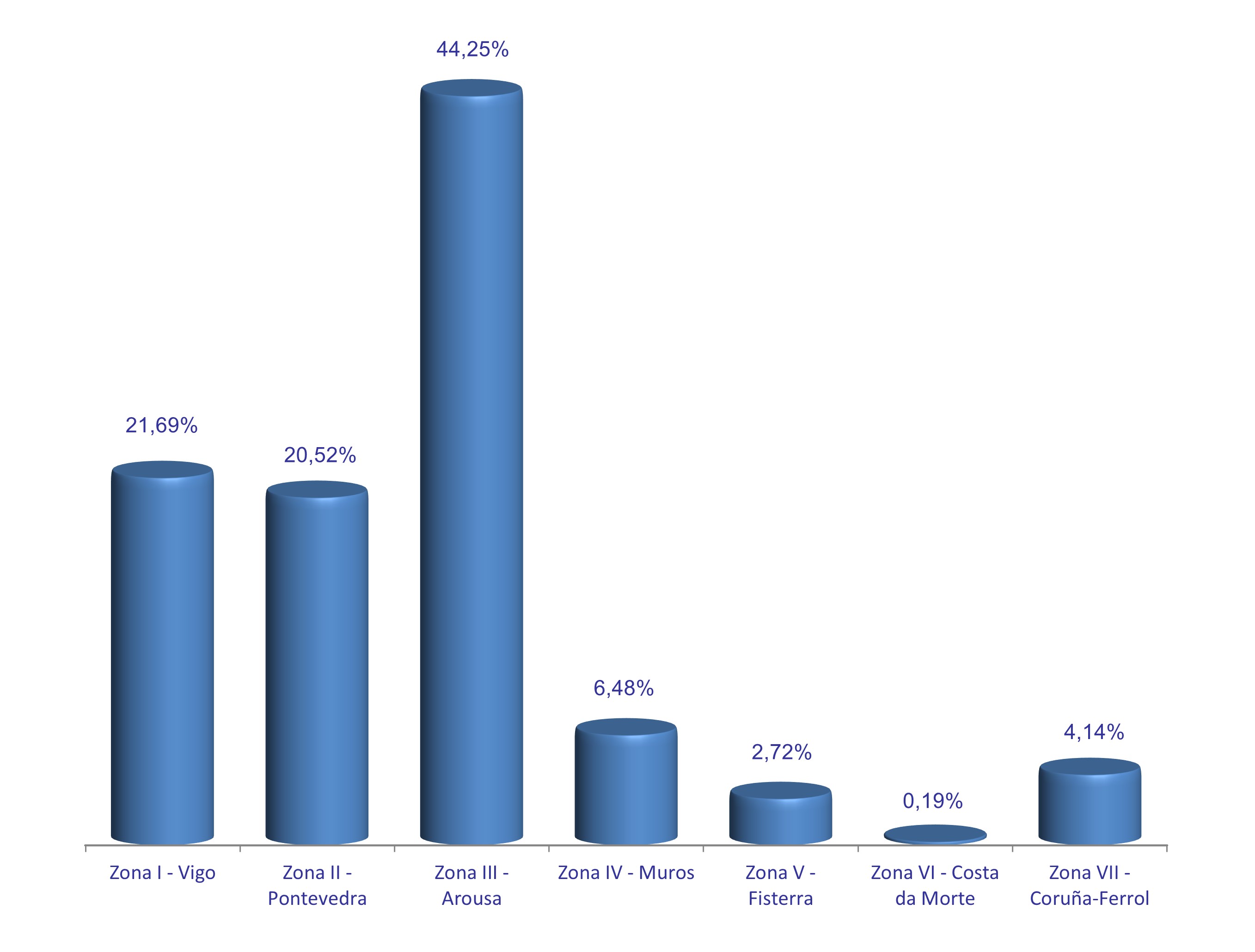 | Zona III - Arousa | 251 | 217.892 | 44,25% | 3.140.000 | 43,17% | 14,41 |