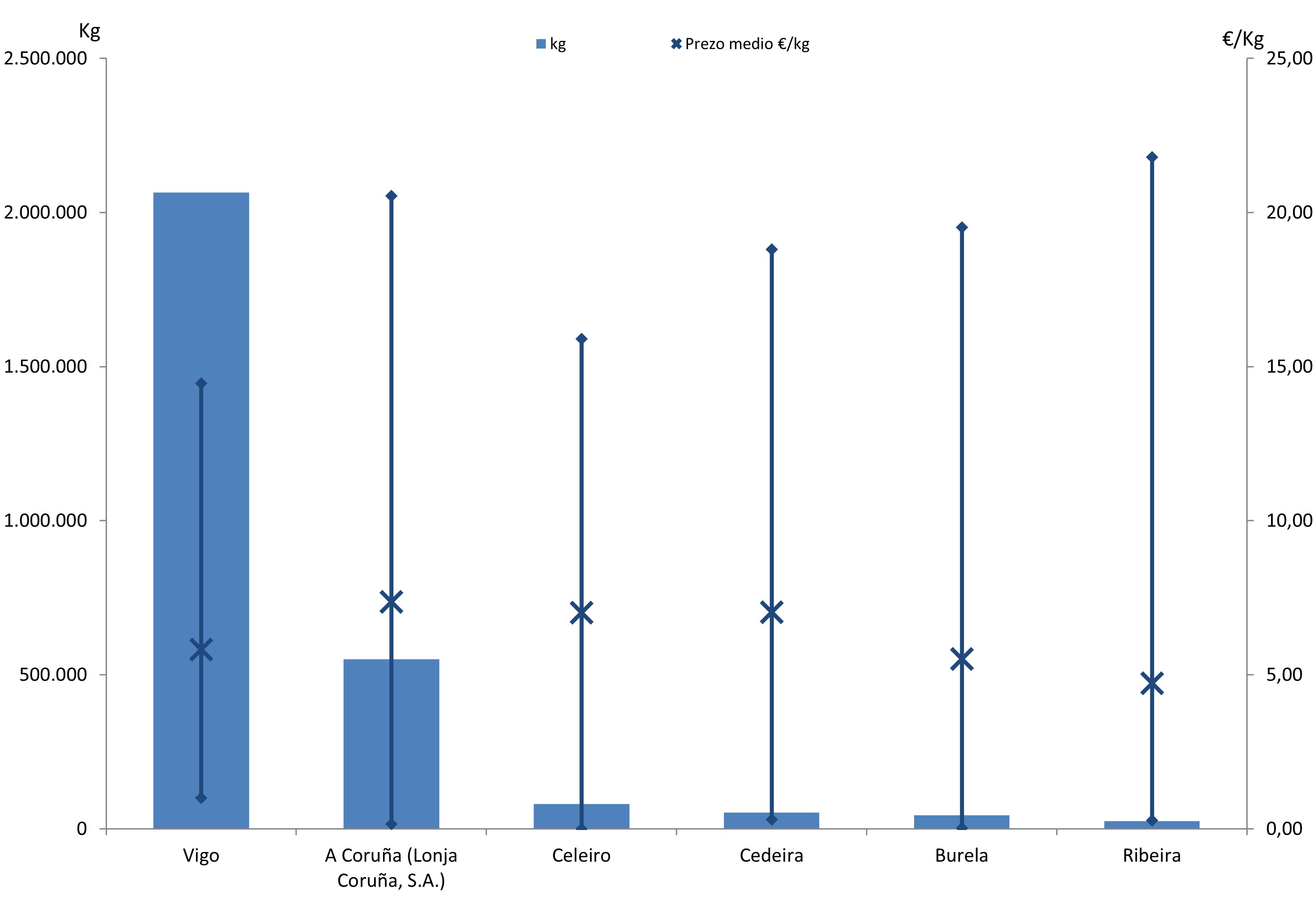 | A Coruña (Lonja Coruña, S.A.) | 284 | 550.437 | 19,06% | 4.056.115 | 22,92% | 7,37 |