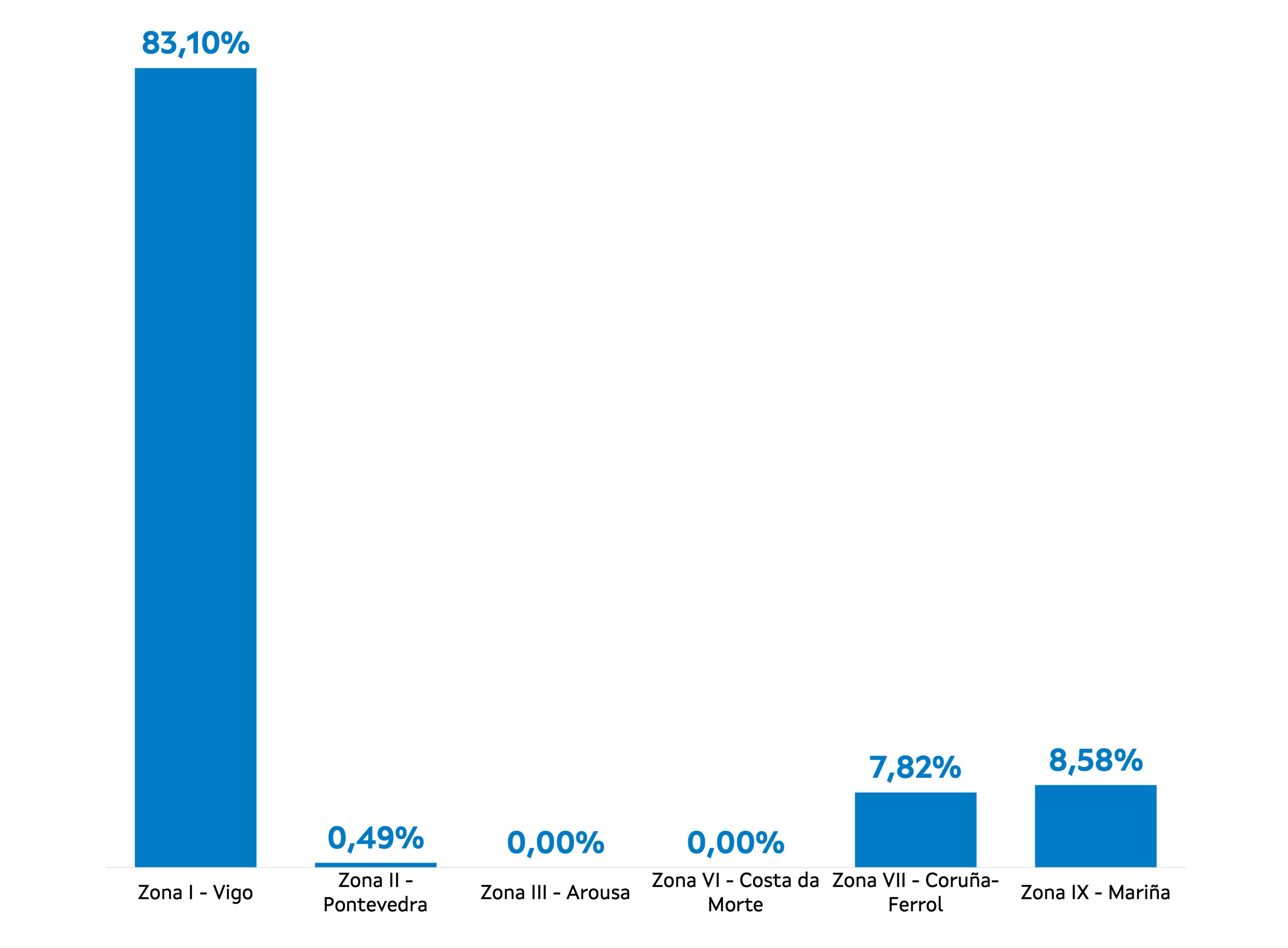 | Zona II - Pontevedra | 71 | 9.972 | 0,49% | 42.284 | 0,46% | 4,24 |