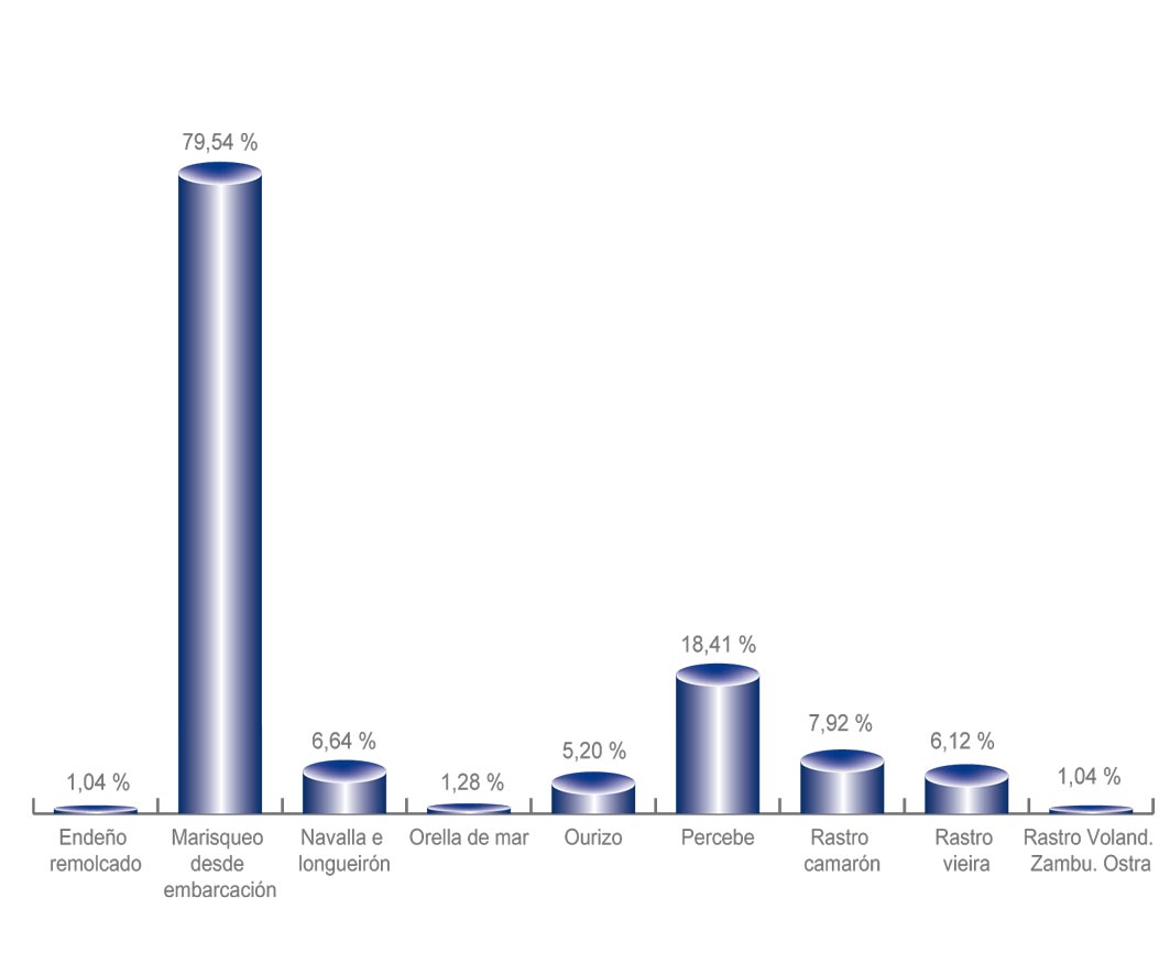 | Artes de marisqueo | 3.270 | -0,73% | 100,00% | 0,00% | 4.418 | -1,44% | 59.563 | -4,86% |