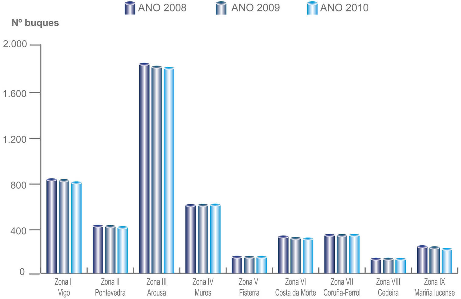 | Zona III - Arousa | 1.804 | -10 | 6,60 | -0,03 | 15,20 | -0,28 | 45,89 | -0,61 |