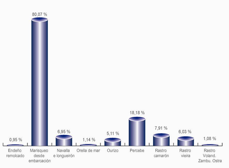 | Marisqueo desde embarcación | 2.603 | 0,08% | 80,07% | 0,53% | 2.587 | 0,25% | 38.301 | 0,09% |