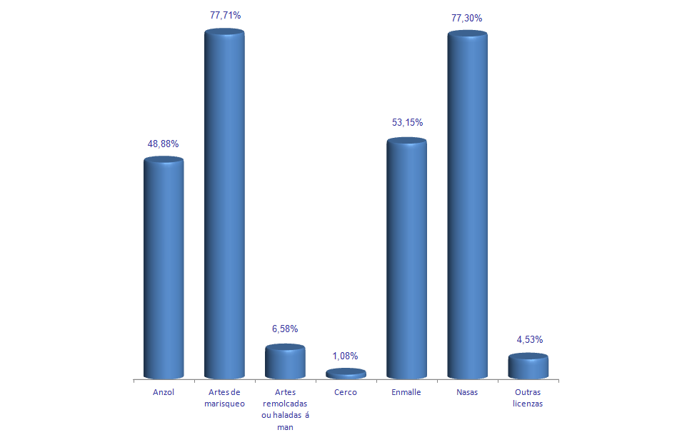| Artes de marisqueo | 3.224 | -0,83% | 77,71% | 0,08% | 4.383 | 0,26% | 60.261 | 2,08% |