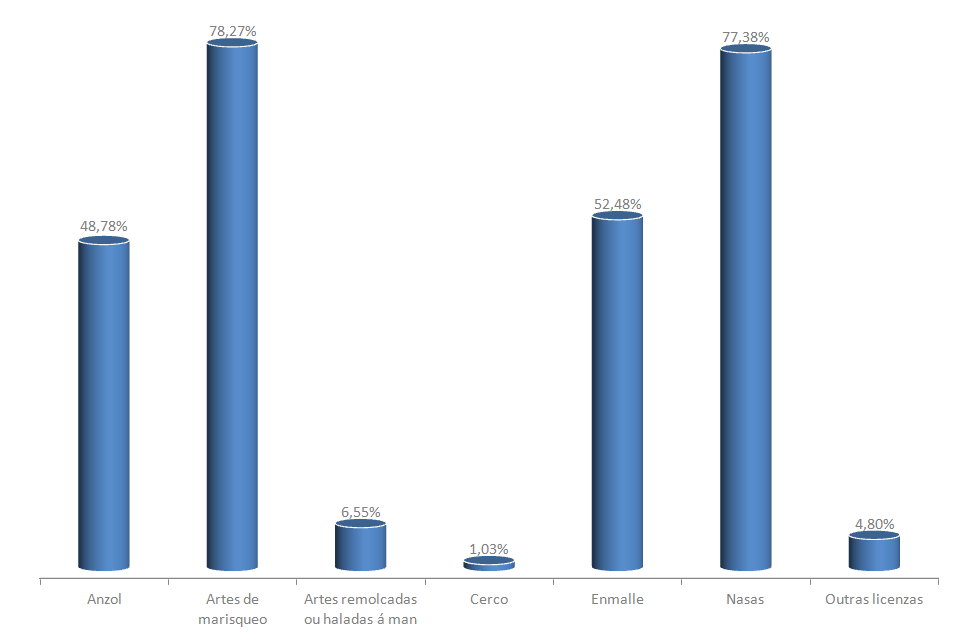 | Artes de marisqueo | 3.177 | -1,46% | 78,27% | 0,57% | 4.288 | -2,17% | 59.613 | -1,08% |