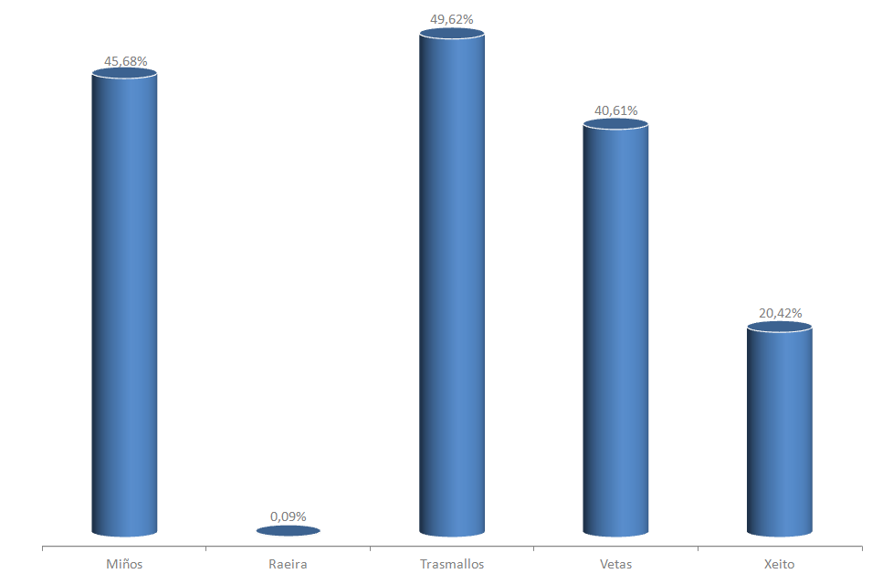 | Miños | 973 | -3,85% | 45,68% | -0,21% | 5.313 | -5,21% | 45.452 | -5,35% |