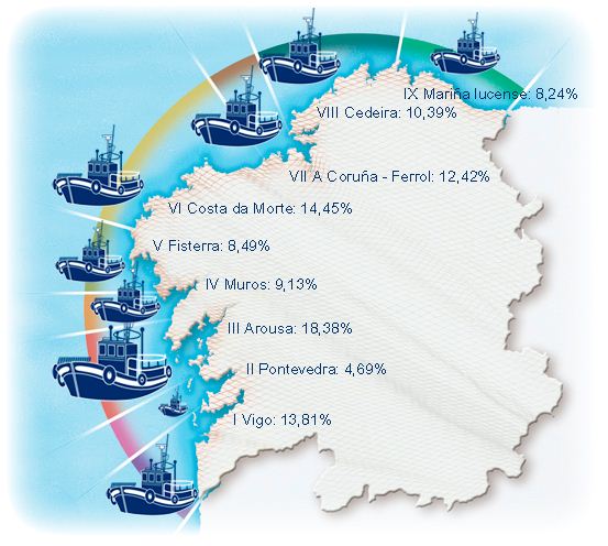 | Zona VI - Costa da Morte | 114 | 2,70% | 14,45% | 0,34% | 774 | 13,45% | 5.185 | 7,11% |