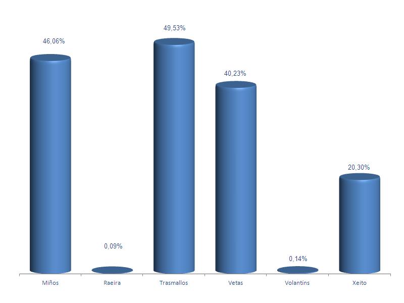 | Miños | 971 | -0,21% | 46,06% | 0,38% | 5.315 | 0,04% | 45.435 | -0,04% |