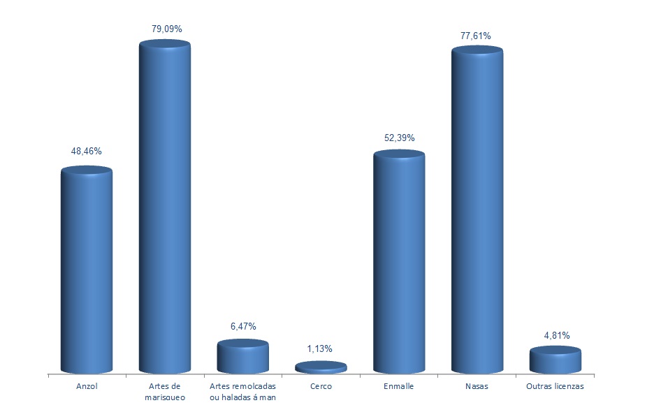 | Artes de marisqueo | 3.140 | 0,00% | 79,09% | 0,93% | 4.651 | 10,09% | 71.514 | 20,38% |
