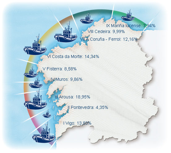 | Zona III - Arousa | 148 | 2,07% | 18,95% | 0,57% | 492 | 0,61% | 5.175 | 7,49% |