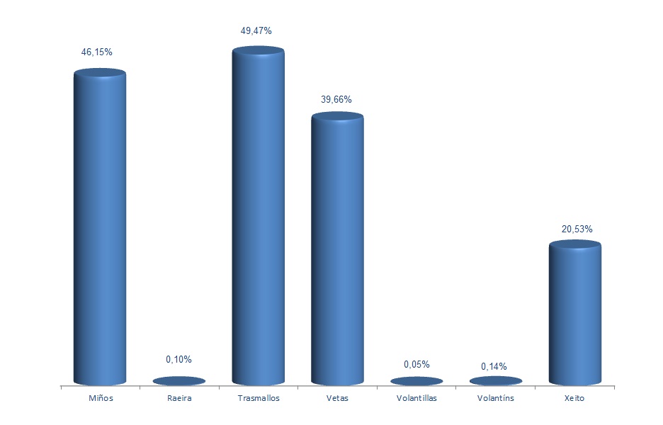 | Miños | 960 | -1,13% | 46,15% | 0,09% | 5.184 | -2,46% | 44.943 | -1,08% |