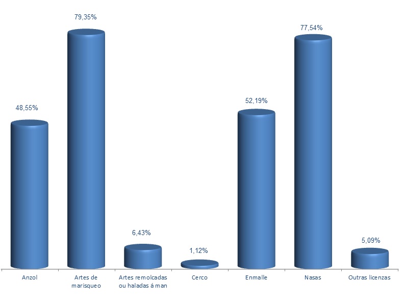 | Artes de marisqueo | 3.120 | -0,64% | 79,35% | 0,26% | 4.644 | -0,14% | 73.338 | 2,55% |