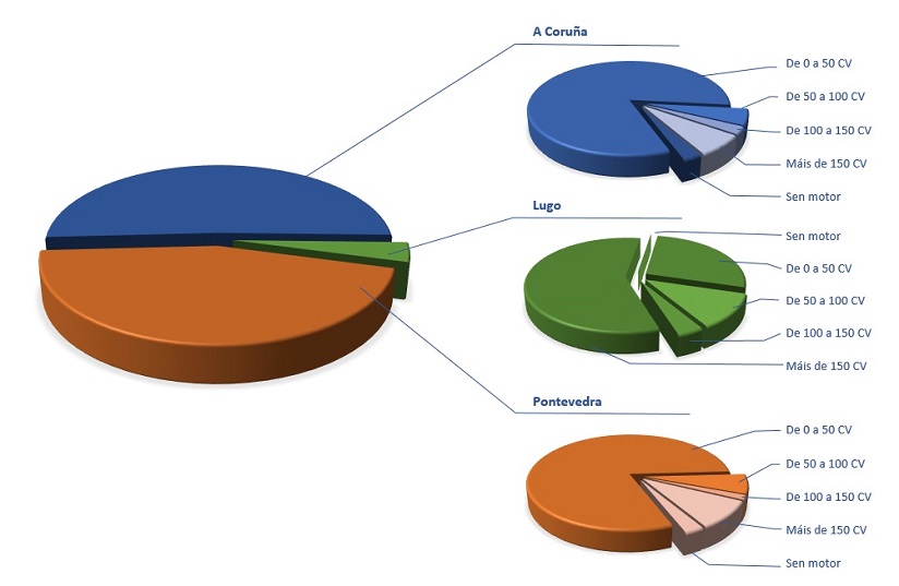| Sen motor | De 0 a 50 CV | De 50 a 100 CV | De 100 a 150 CV | Máis de 150 CV | Total | ||||||||