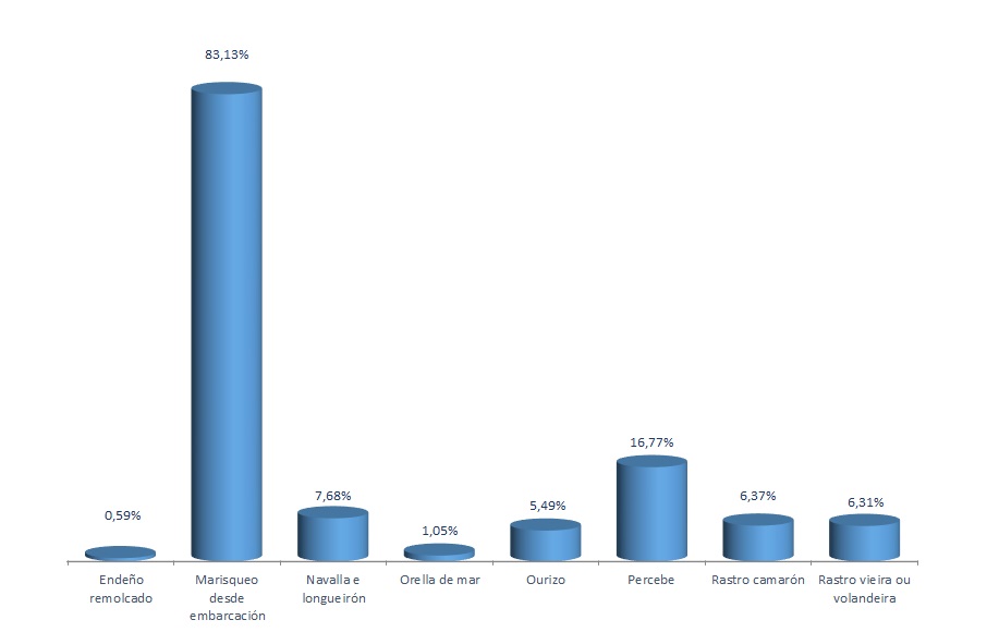 | Marisqueo desde embarcación | 2.543 | 0,04% | 83,13% | 1,05% | 3.327 | 4,20% | 58.322 | 0,35% |