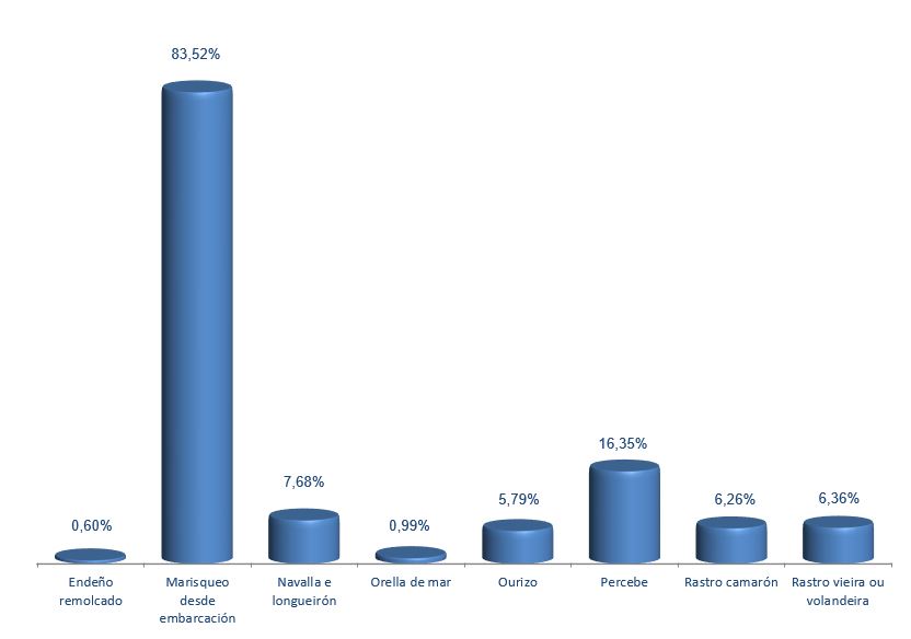 | Marisqueo desde embarcación | 2.523 | -0,79% | 83,52% | 0,38% | 3.318 | -0,29% | 58.392 | 0,12% |