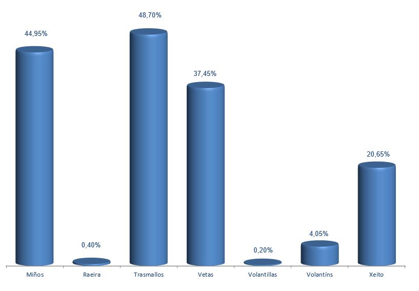 | Miños | 899 | -1,53% | 44,95% | -0,07% | 4.537 | -1,20% | 40.524 | -1,42% |
