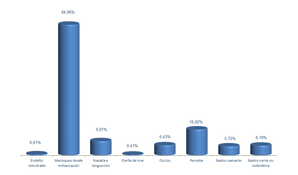 | Marisqueo desde embarcación | 2.483 | -0,32% | 84,06% | 0,24% | 3.345 | 0,54% | 58.766 | 0,21% |