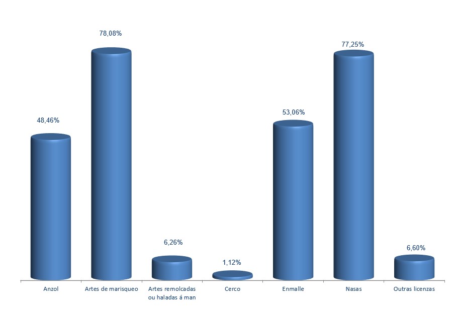 | Artes de marisqueo | 2.921 | -1,12% | 78,08% | -0,36% | 4.485 | -3,47% | 74.666 | -0,57% |