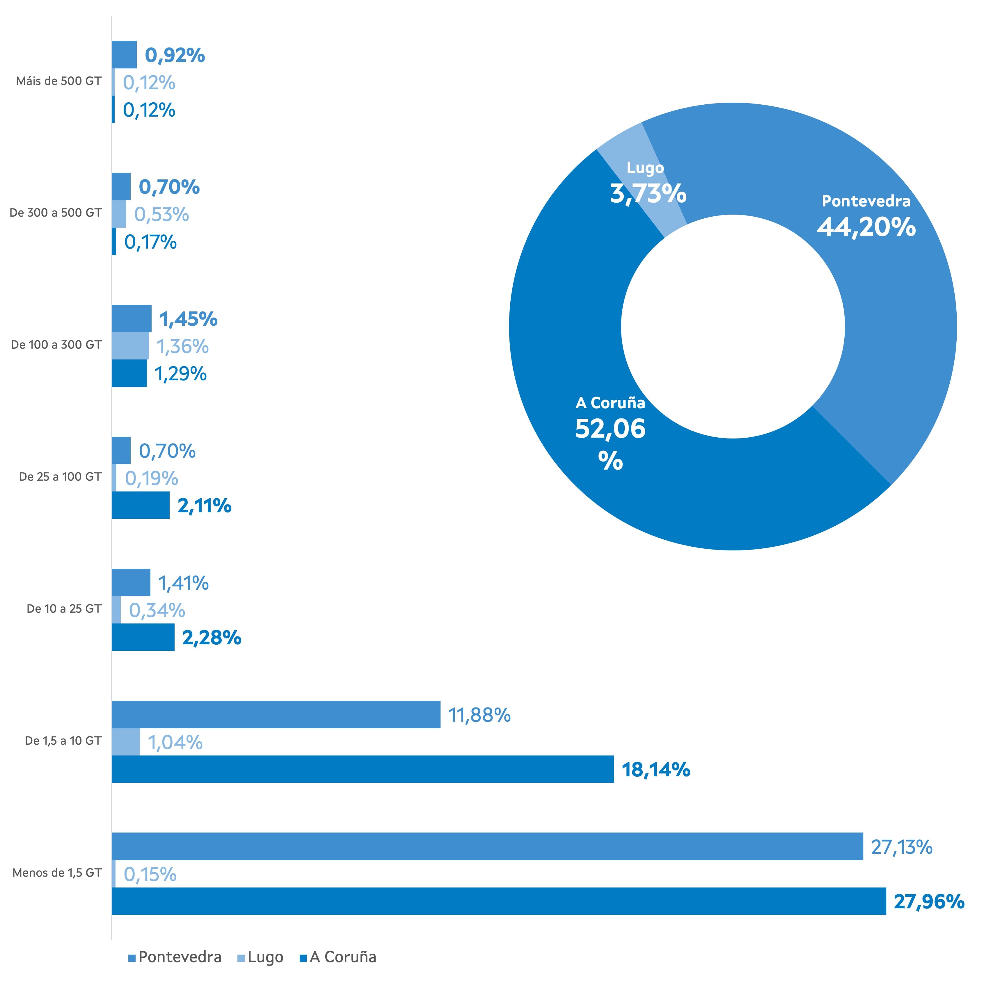 | Menos de 1,5 GT | De 1,5 a 10 GT | De 10 a 25 GT | De 25 a 100 GT | De 100 a 300 GT | De 300 a 500 GT | Máis de 500 GT | Total | |||||||||