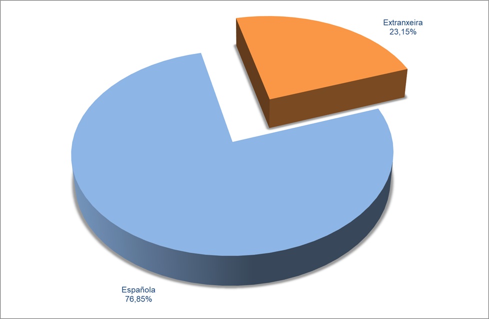 | Estranxeira | 1.456 | 16,85% | 808 | 65,69% | 283 | 25,00% | 2.547 | 23,15% |
