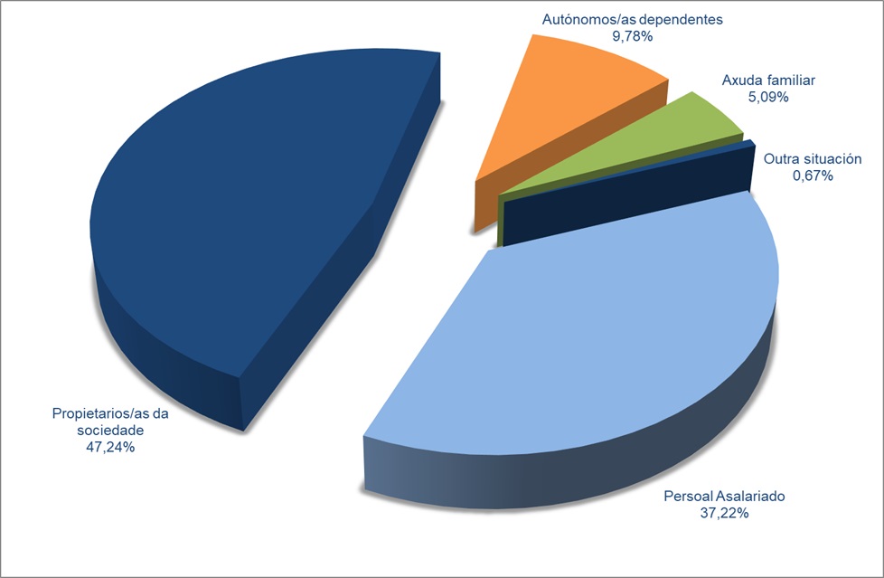 | Propietarios/as da sociedade | 1.608 | 51,72% | 496 | 67,67% | 3 | 0,49% | 2.107 | 47,24% |